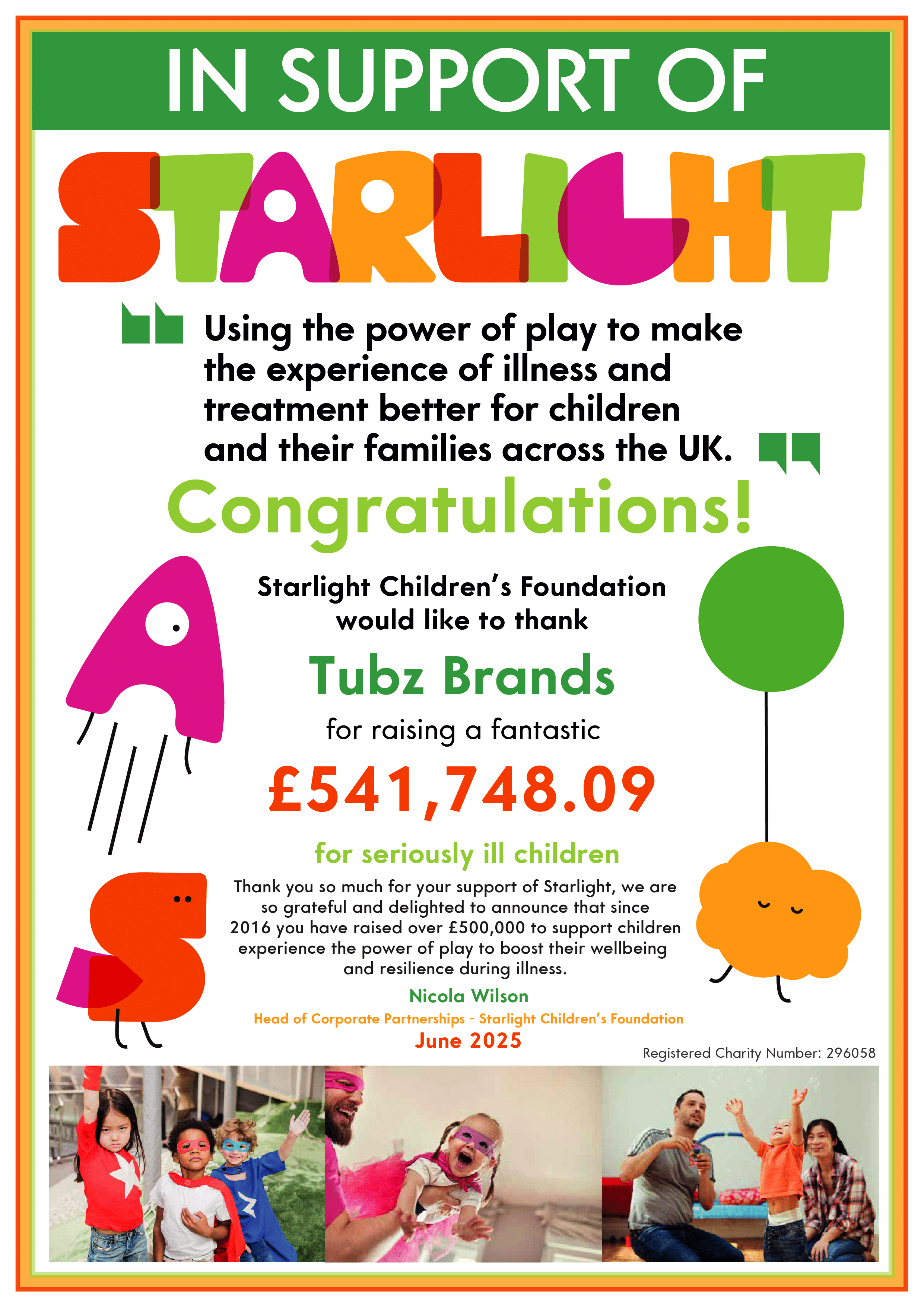 Once again, on behalf of Tubz Brands and the children and families who benefit from the work of Starlight Children’s Foundation, thank you for your support.